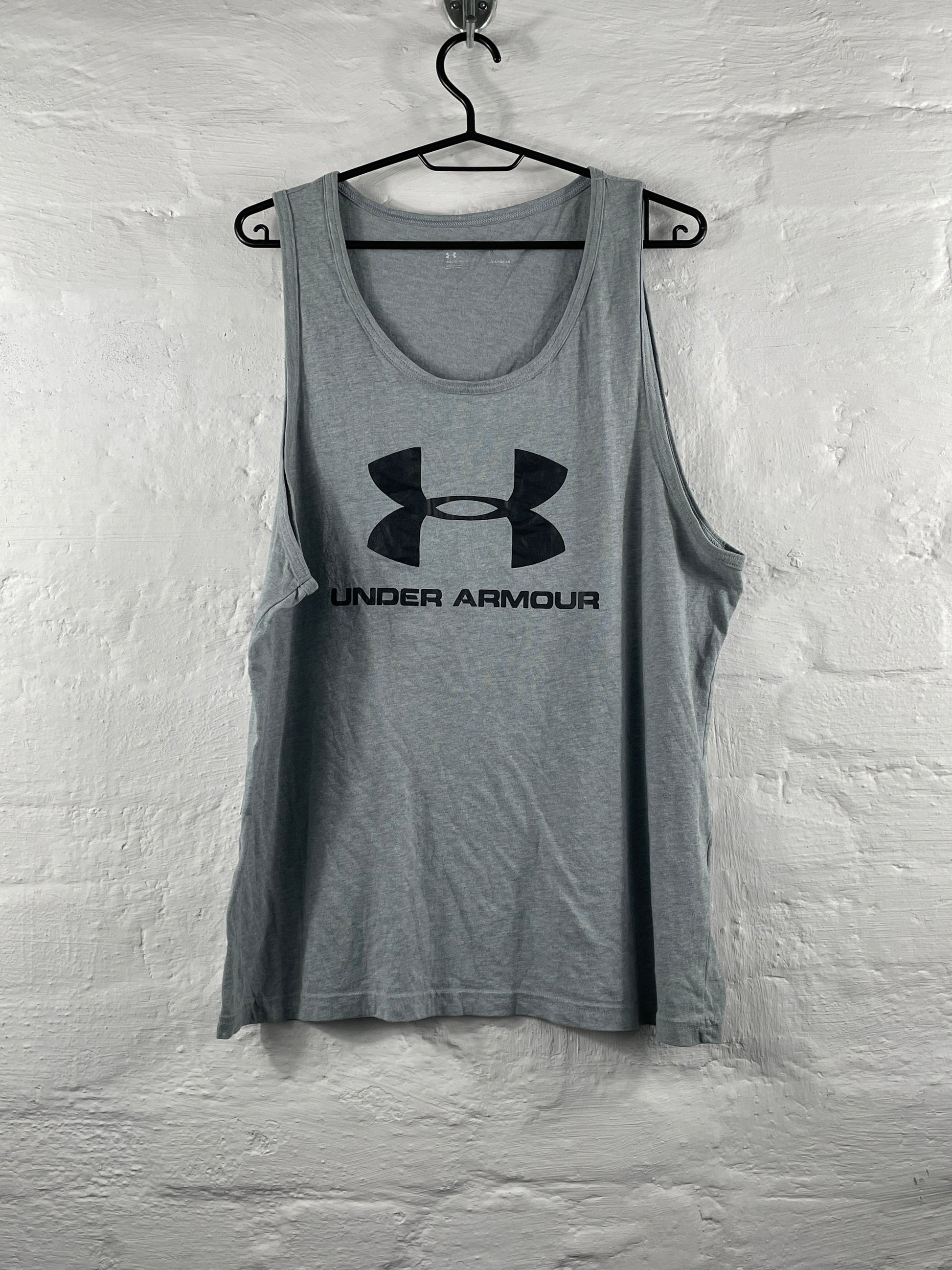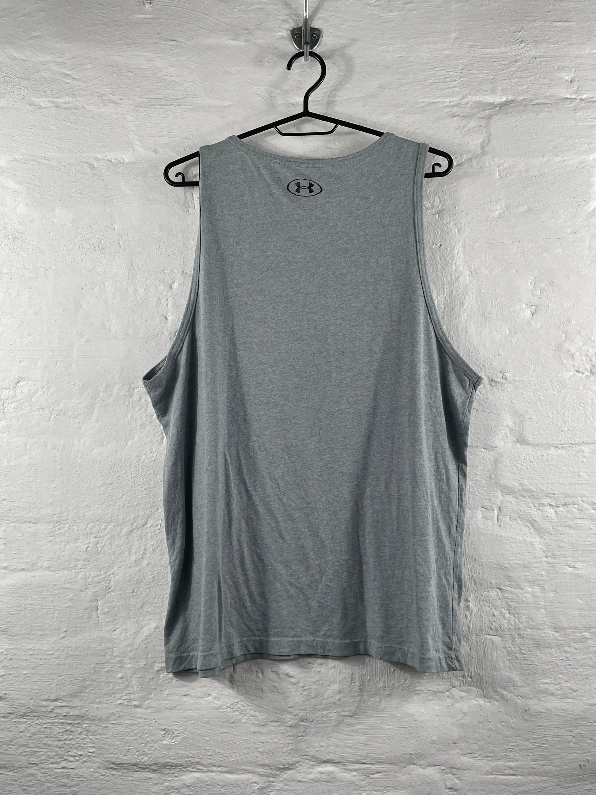 Lightweight Under Armour tank top in grey with a large black logo print on the chest. This style impresses with its breathable, quick-drying material and relaxed fit – ideal for sports, the gym, or casual summer looks.