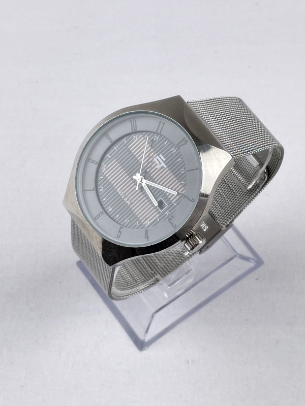 Diese ET Solar Armbanduhr kombiniert modernes Design mit innovativer Technik. Das schwarze Zifferblatt mit vertikaler Streifenstruktur und klaren Indizes wird durch das Edelstahlgehäuse und das silberne Milanaise-Armband elegant ergänzt. Dank Solartechnologie ist keine Batteriewechsel nötig – die Uhr lädt sich durch Licht auf und bleibt zuverlässig einsatzbereit. Eine zusätzliche Datumsanzeige auf 3 Uhr rundet die Funktionalität ab.