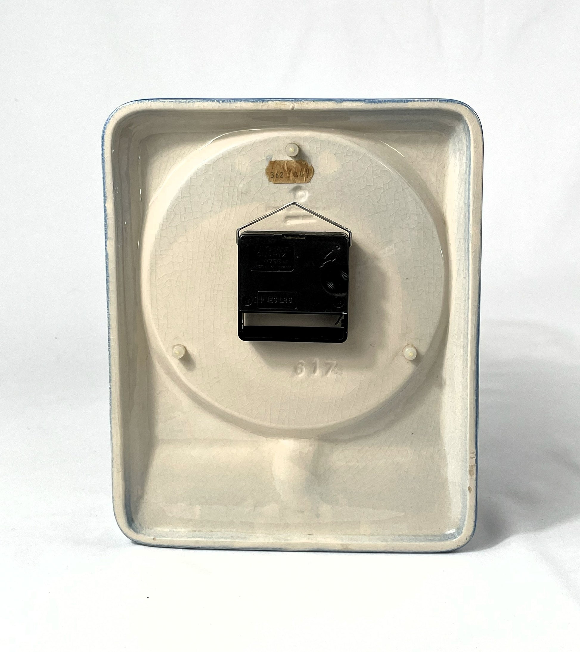 Diese Vintage Wanduhr von Junghans vereint präzise deutsche Uhrmacherkunst mit stilvollem Keramikdesign. Das rechteckige Gehäuse in zartem Hellblau ist dezent strukturiert und mit feinen Linien akzentuiert, was der Uhr einen zeitlos eleganten Charakter verleiht.