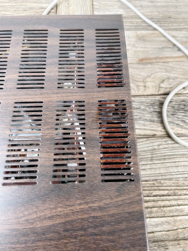 • Optischer Hinweis: An der Gehäuseoberseite wurde eine kleine Stelle in der Holzoptik-Folie retuschiert (siehe Foto).