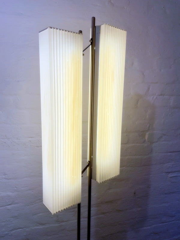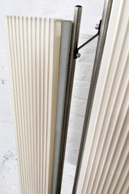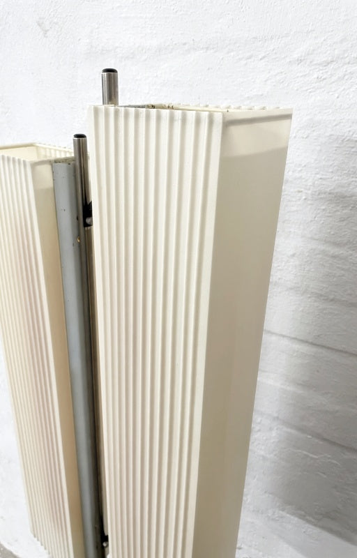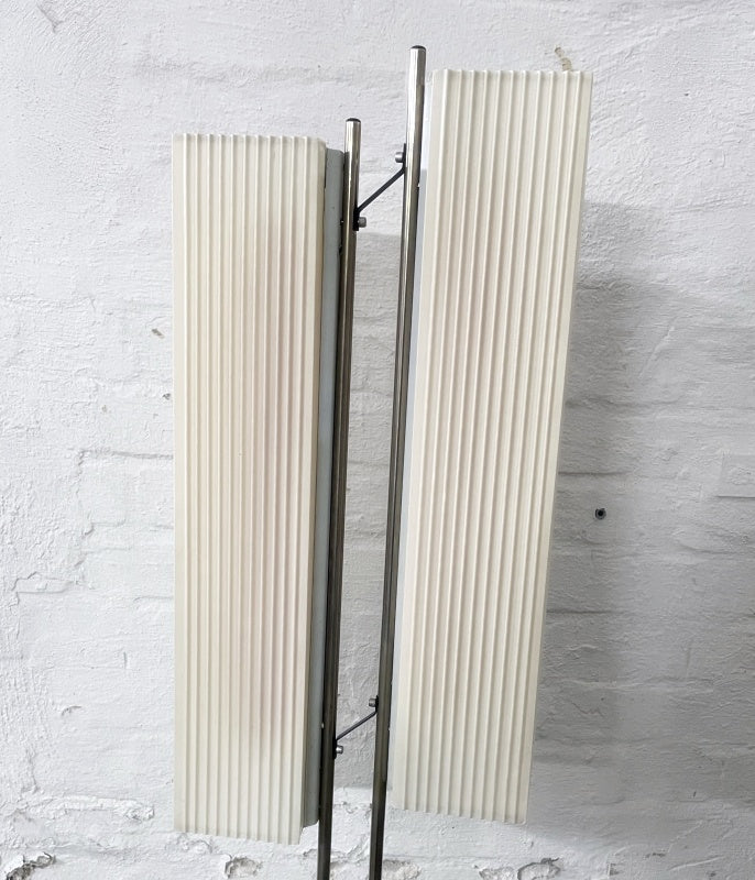 Diese originale Vintage-Stehleuchte von Seifert & Tilitz KG, Berlin, stammt aus den späten 1970er Jahren und steht exemplarisch für die deutsche Designszene zwischen Mid-Century Modern und Space-Age-Stil. Das Modell 6067 beeindruckt durch seine zwei vertikal angeordneten, geriffelten Acrylschirme, die ein angenehm diffuses, warmes Licht erzeugen und eine authentische Retro-Atmosphäre schaffen.