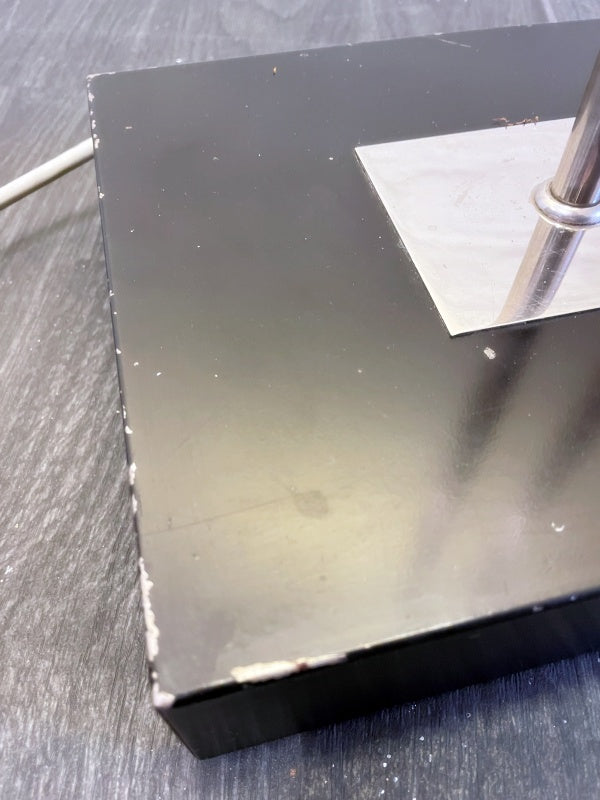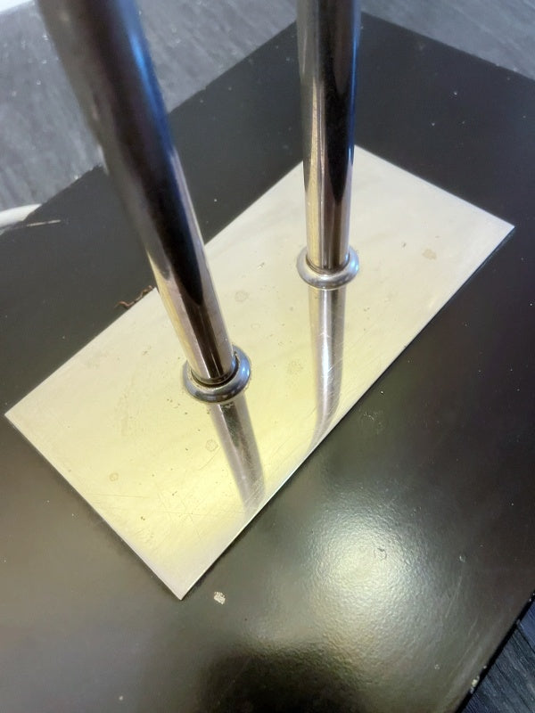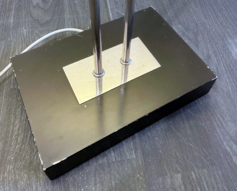 Der verchromte Doppelstab ist auf einem stabilen Metallfuß mit Messingplatte montiert. Trotz leichter altersbedingter Kantenabplatzer bleibt der Gesamteindruck gepflegt. Die Schirme zeigen eine gleichmäßige, altersbedingte Patina, wie sie bei originalem Acryl der 1970er typisch ist – ein schönes Zeichen für die Echtheit und das Alter dieses Stücks.
