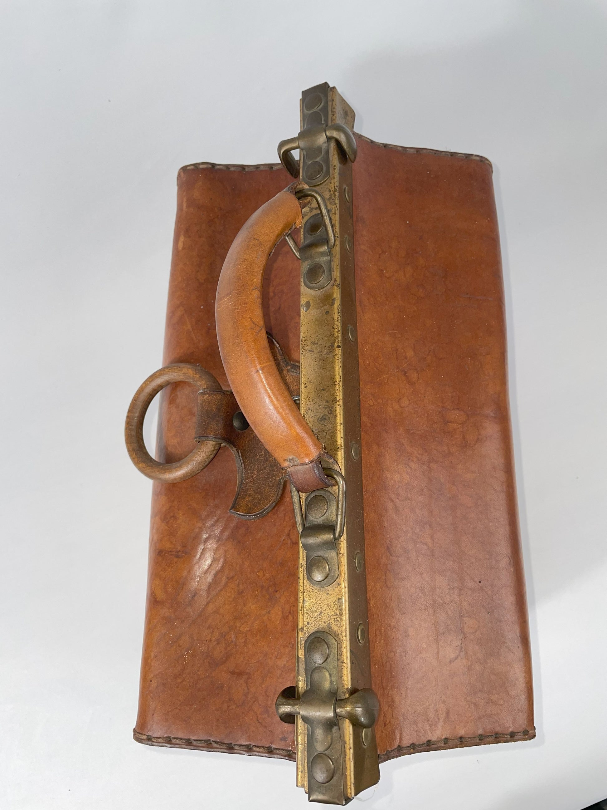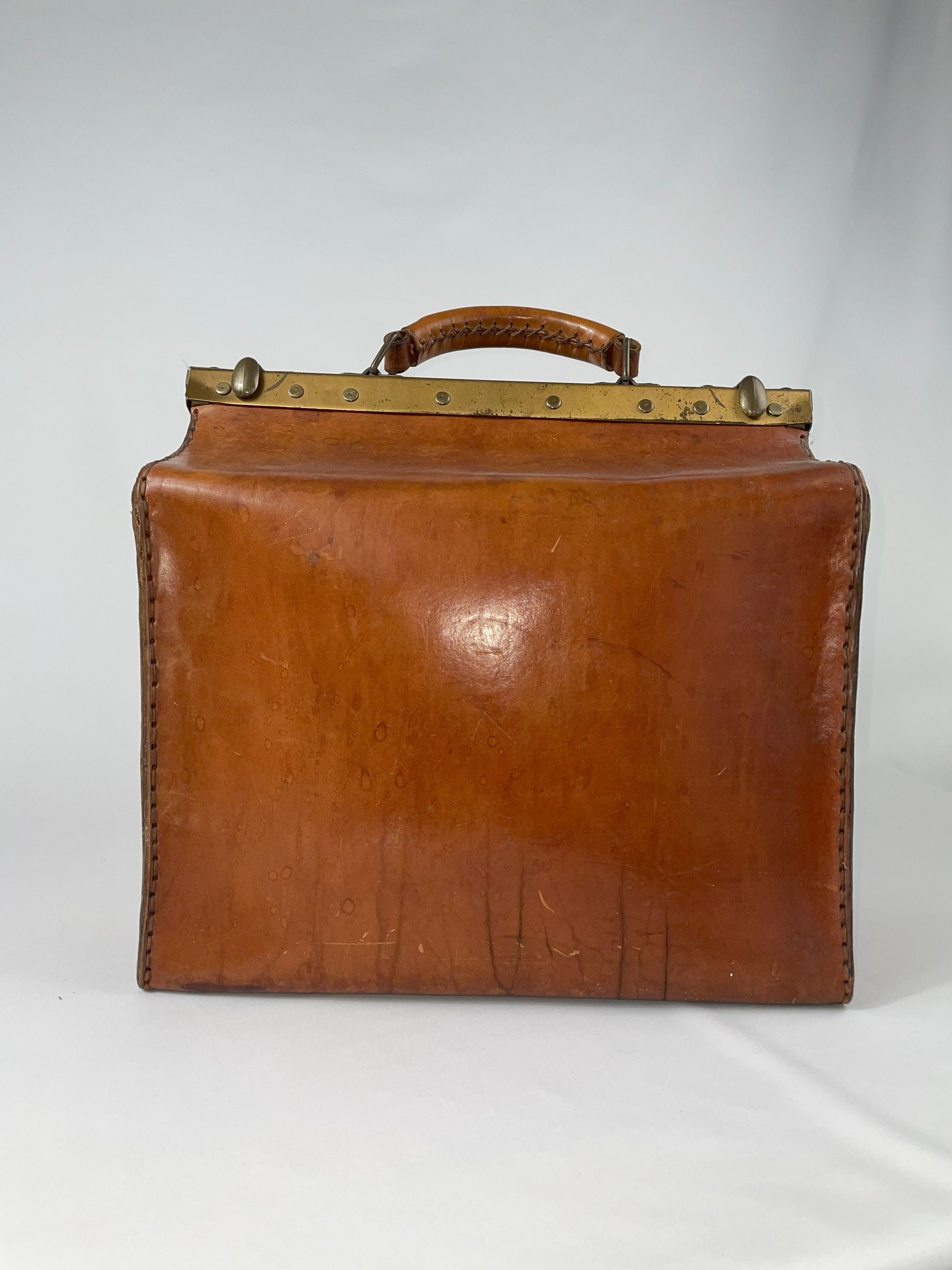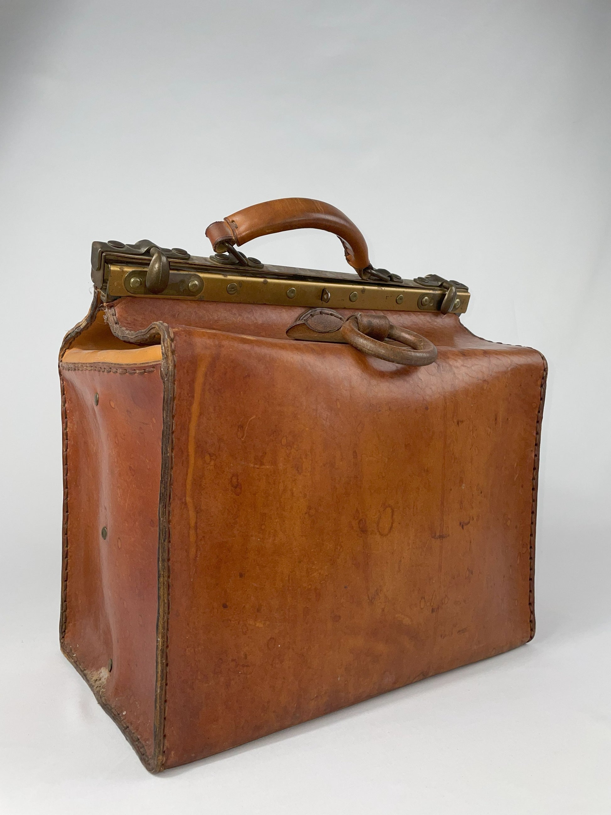 Diese originale Vintage Arzttasche aus robustem, braunem Leder ist ein eindrucksvolles Stück Handwerkskunst. Mit ihren massiven Messingbeschlägen und dem charakteristischen Bügelverschluss verkörpert sie den klassischen Stil früher Arzt- und Hebammentaschen.