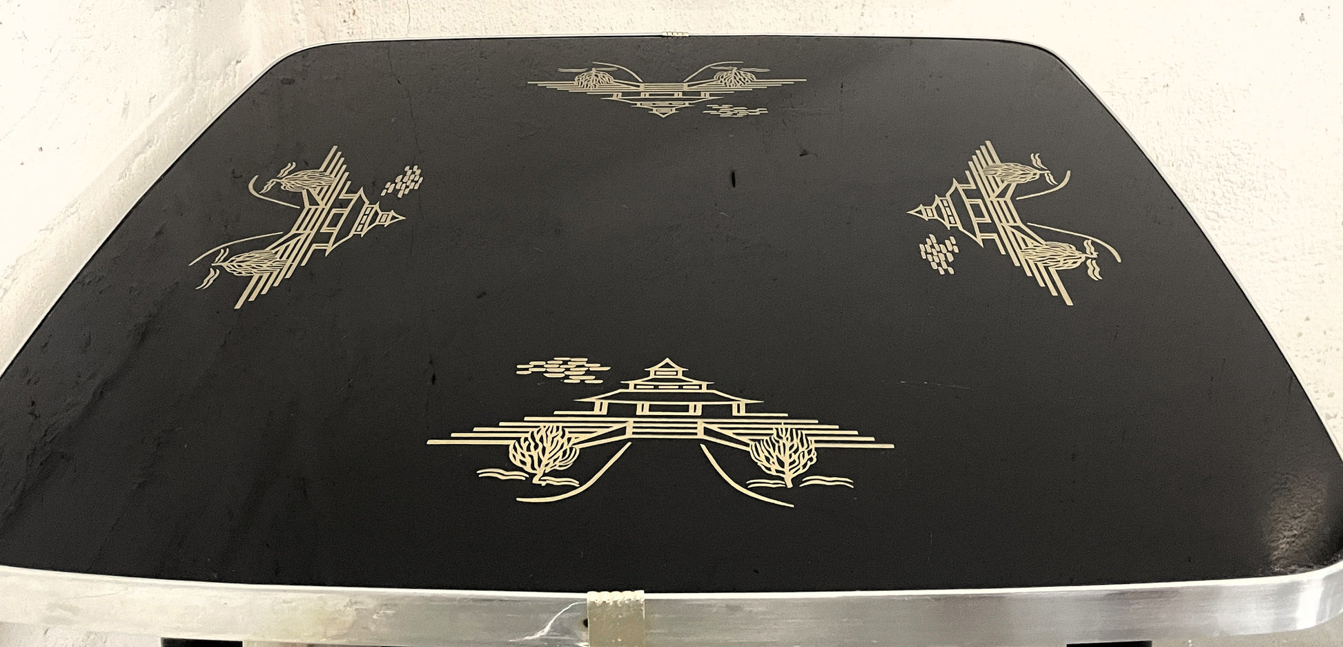 Dieser originale Beistelltisch aus der DDR, vermutlich aus der Manufaktur Albert Busch, besticht durch sein charakteristisches Mid-Century-Design und die hochwertige Verarbeitung. Die schwarze Tischplatte ist mit dekorativen, goldfarbenen Motiven im fernöstlichen Stil verziert und wird von einem umlaufenden Metallrand eingefasst, der dem Möbelstück einen eleganten Akzent verleiht. Getragen wird die Platte von vier schlanken, schwarzen Holzbeinen, die für Stabilität sorgen und den minimalistischen Charakter des Tisches unterstreichen.